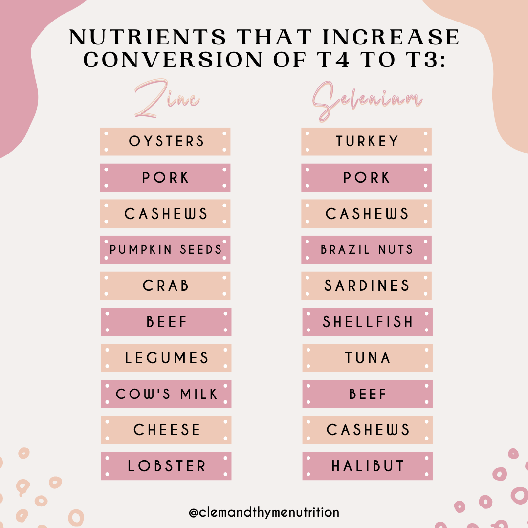 TWO nutrients that increase conversion of T4 to T3 & foods you can find them in⁠: