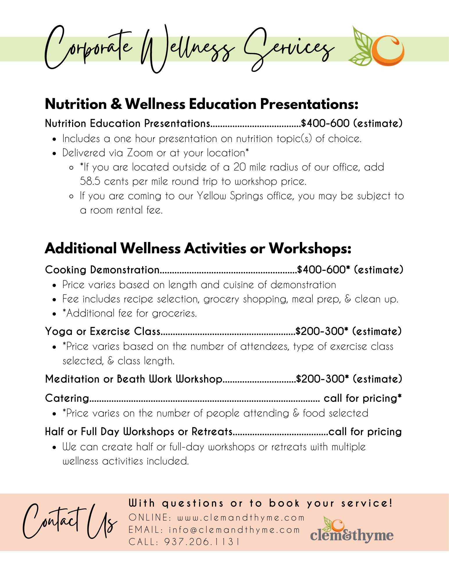 The dietitians at Clem&Thyme Nutrition are passionate about getting healthy. Let us motivate your employees or group members. We cater our services to your organization, but the most popular services are listed below.